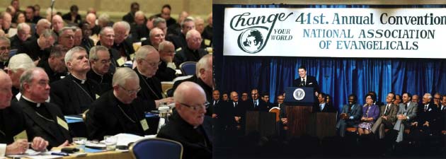 WHAT'S PARTICULARLY FRIGHTENING ...What's particularly frightening in all of this is that the candidacy of Rick Santorum is coming at a time when the 500-year old breach between Catholicism and Protestantism (especially the conservative, politically-oriented elements in both religious groups) is coming to an end - which can only serve to magnify the horror these right-wing groups (when acting in consort with one another) are capable of generating. And, as if to give evidence regarding the growing unity between them, 150 of the most prominent leaders in evangelical Christianity agreed on January 14 of this year to endorse Santorum for president, including Tony Perkins, the president of the Family Research Council, James Dobson of Focus on the Family, Pastor Jim Garlow, head of the giant Skyline Wesleyan Church in San Diego and leader of California's anti-gay campaign, Richard Land, past president of the largest Protestant domination in the country, the Southern Baptist Convention, etc. WHAT THIS CLEARLY INDICATES - ESPECIALLY IN LIGHT OF JAMES DOBSON'S AND RICHARD LAND'S PARTICIPATION - IS JUST HOW FAR THE LEADERS OF TODAY'S EVANGELICAL CHURCH HAVE STRAYED FROM THE PLAIN TEACHINGS OF THE SCRIPTURE IN THEIR PURSUIT TO "SAVE AMERICA FOR CHRIST." [We URGE you to see APPENDIX 1 for more information on this subject; in addition, we again URGE you to see APPENDIX 2 for a discussion as to just how far evangelicals have retreated from their historical attitude regarding Roman Catholicism."]